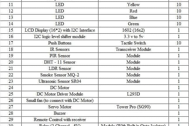 Sensors: IR, PIR, DHT11, LDR, Smoke (MQ-2), Ultrasonic