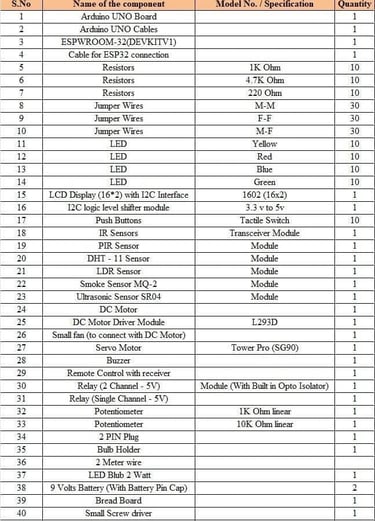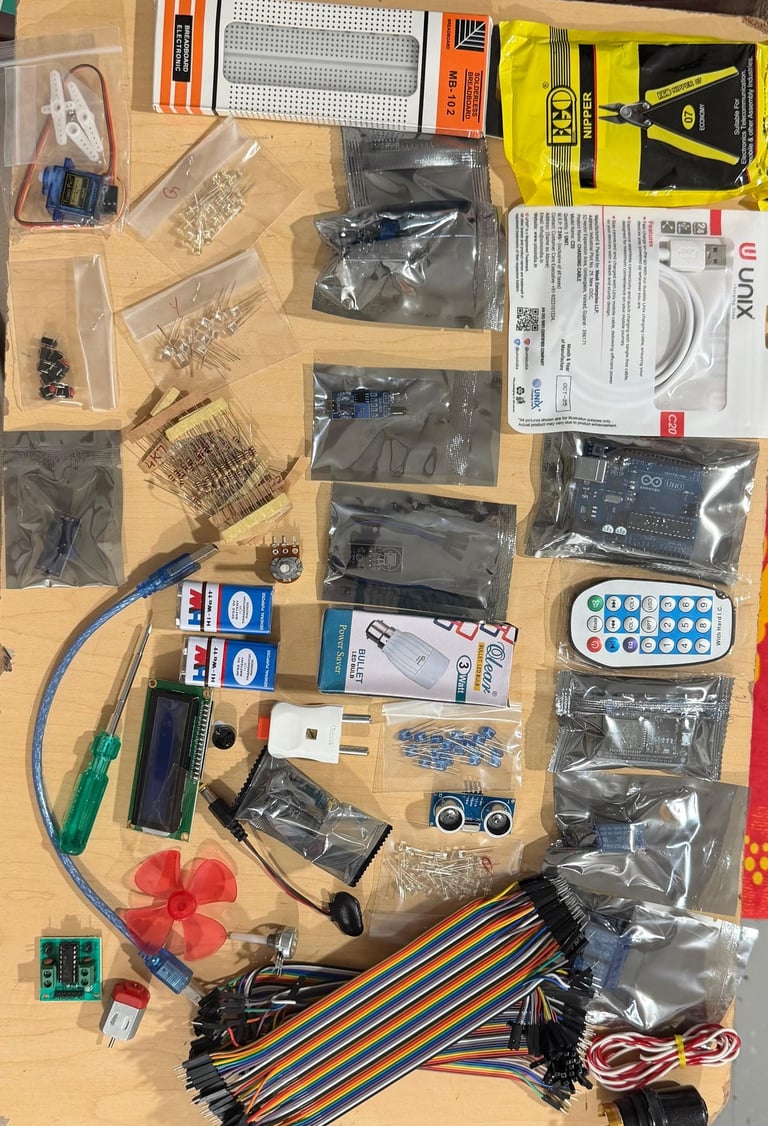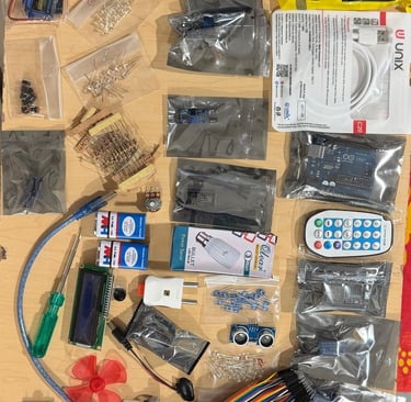 The hardware kit includes a wide range of components commonly used in electronics and IoT projects, such as: